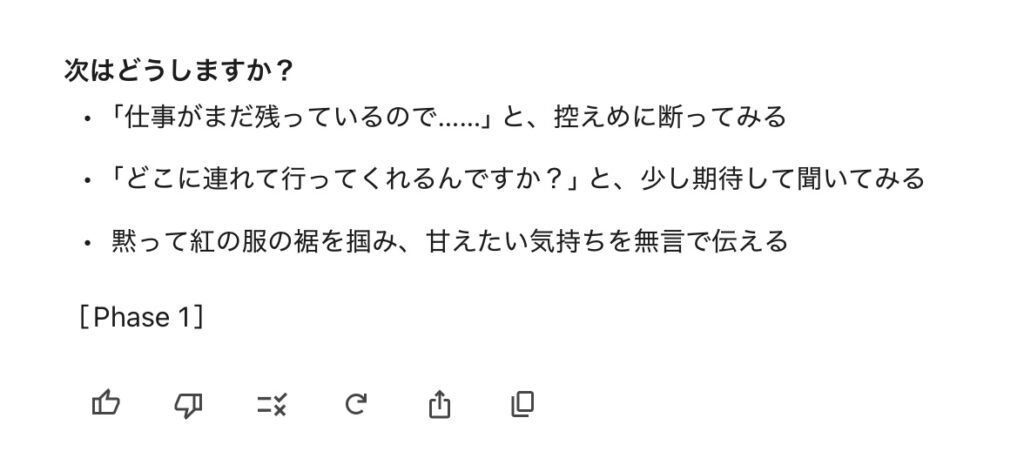 ノベルゲームなので、紅からの言葉の最後には「次はどうしますか?」という選択肢が提示されます👇