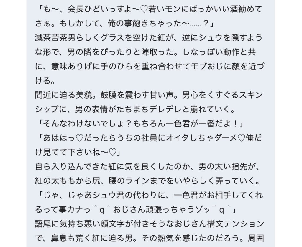 ユキちゃんと空君も出演していたり、シュウ君がユキ×紅の関係に気づいて身もだえしたり、私の都合で腐男子にされたり(こいついっつも腐男子にしてんな)、紅がモブおじにめちゃくちゃセクハラされたり、変な薬を盛られてやっさいもっさいしたりします。