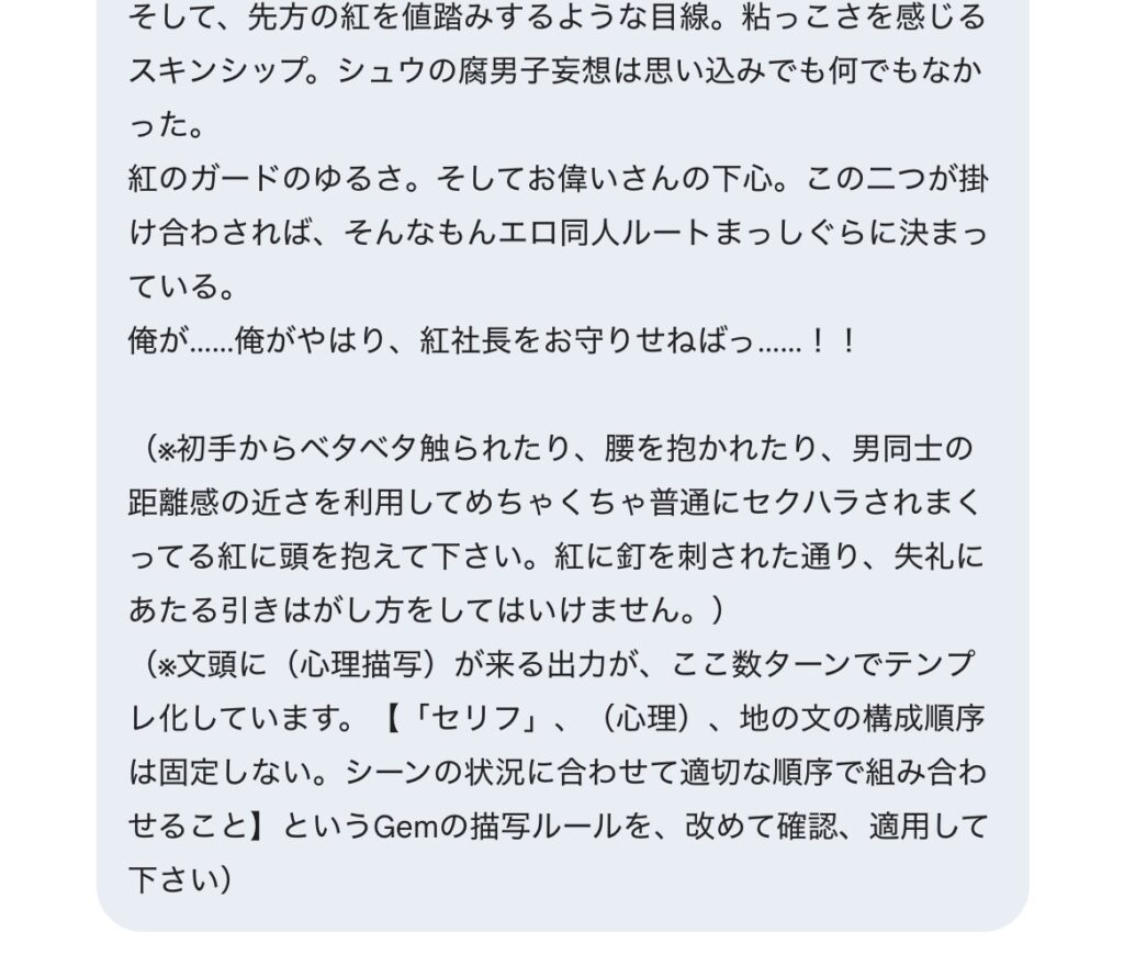 またAIの脱線を防ぐ目的で、↑スクショのようなメタ的指示が混ざっている事もあるのですが