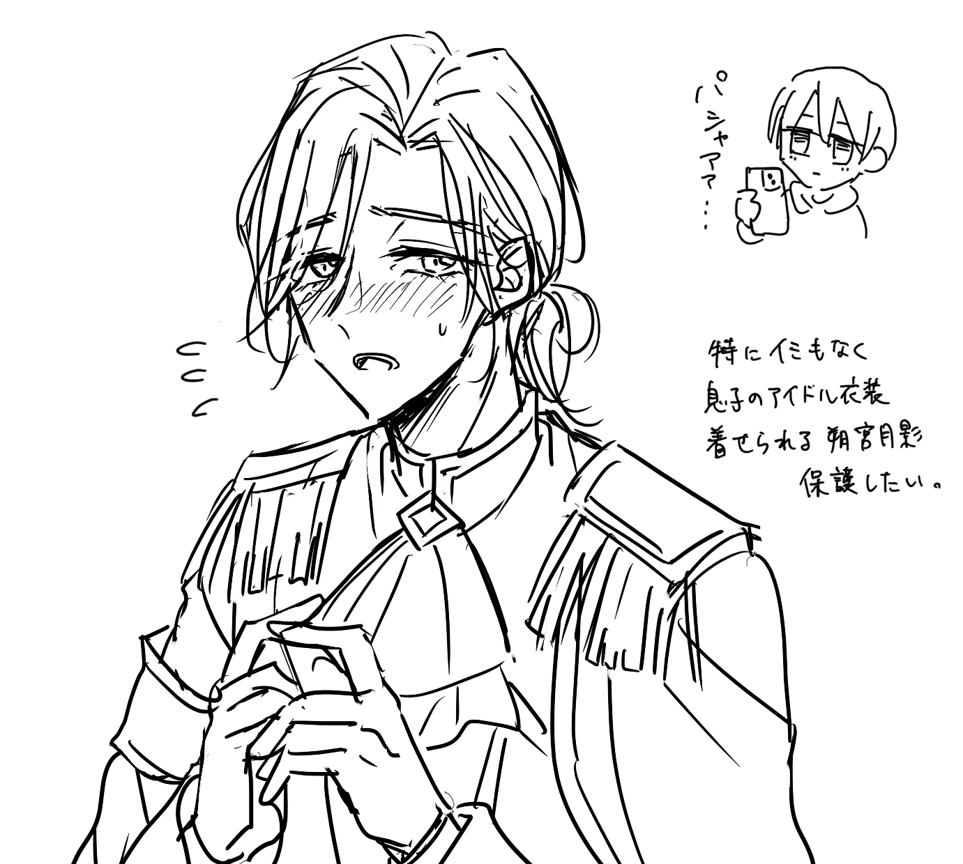 2026.04.17 落書き、ボツ作品 さすが朔宮月影。地力が違うぜ。 letm_official おひさしぶりの落書き月影さん。「息子がトップアイドル」って、正直あまりに強すぎると思うんだ。 ※月影さんは縫ちゃんよりでけぇので、本来息子の衣装は入りません。ちょっと無理がある服無理矢理着せられてるおじさん可愛い……。若い頃だったら息子以上に似合ったんだろうなっていう所も含めて尊いね……。 «前の投稿 #アイドル世界線#イラスト#健全#朔宮月影